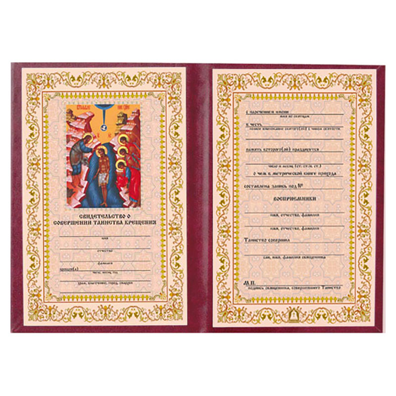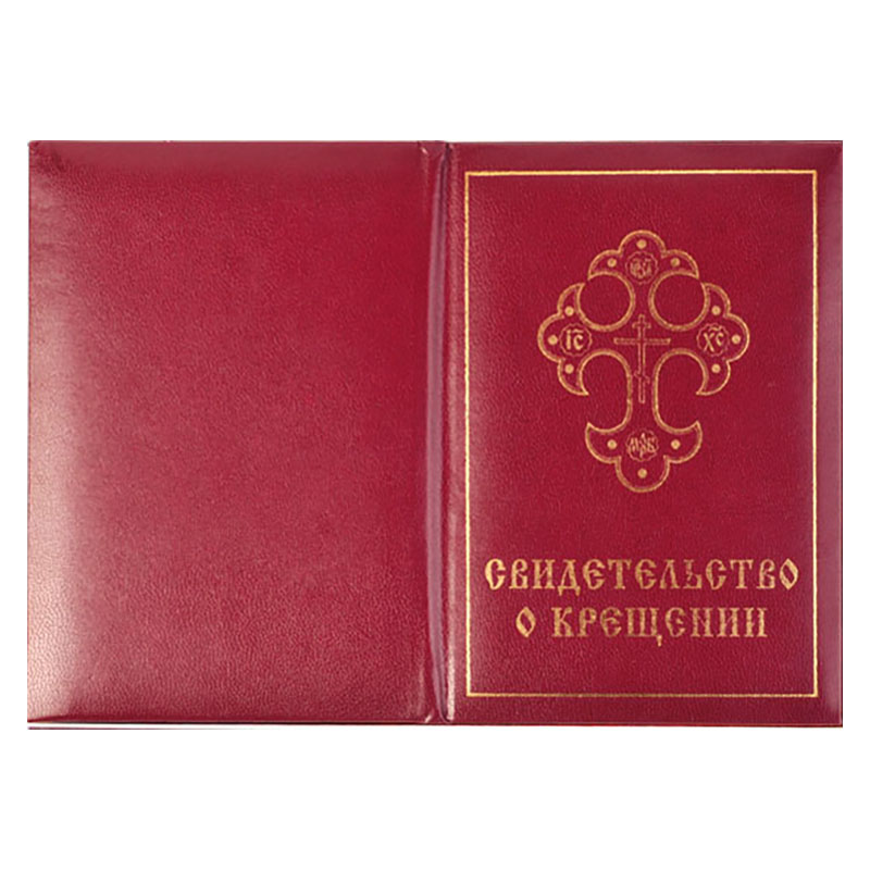 Производственные мастерские «Колокол» предлагают заинтересованному вниманию свидетельство о крещении в мягком бордовом переплете. Прекрасно выполненное в удобном формате книжечки (с золотым тиснением креста и надписи), оно навсегда запечатлеет всю информацию о важном дне, а вклеенный на форзаце бланк сохранит имена крестных родителей.