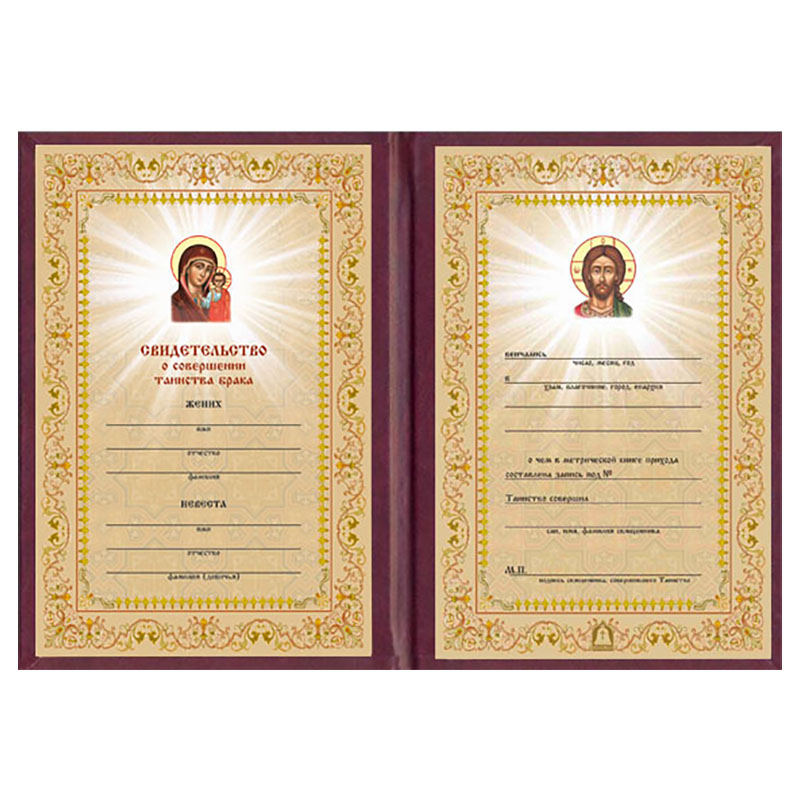 В память об этом удивительном событии выдается свидетельство о венчании. Данный документ будет подтверждением твердости намерения жениха и невесты и их свободной воли. Во внутреннем вкладыше с изображением лика Спасителя и Богородицы разлинованы строки для указания ФИО венчающихся, прихода и даты совершения таинства, номера записи в метрический книге, а также чина, имени и фамилии священнослужителя и места для печати.