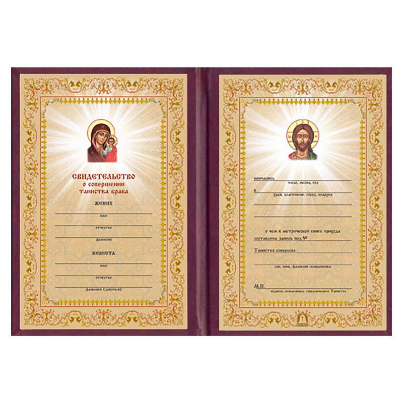 В память об этом удивительном событии выдается свидетельство о венчании. Данный документ будет подтверждением твердости намерения жениха и невесты и их свободной воли. Во внутреннем вкладыше с изображением лика Спасителя и Богородицы разлинованы строки для указания ФИО венчающихся, прихода и даты совершения таинства, номера записи в метрический книге, а также чина, имени и фамилии священнослужителя и места для печати.