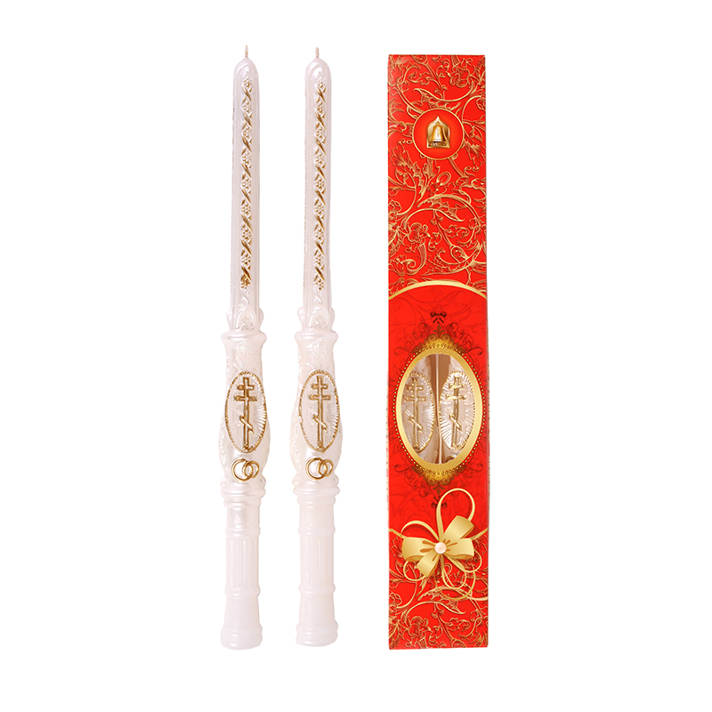 Комплект состоит из двух свечей, помещенных в красочную упаковку. В коробке помещается 30 комплектов свечей средних венчальных парафиновых. Вес коробки с изделиями – 7,85 кг. Невысокая цена (250руб.) при высочайшем качестве данного изделия, являющегося непременным атрибутом обряда венчания, делает данные предметы желанным выбором венчающихся и брачующихся.