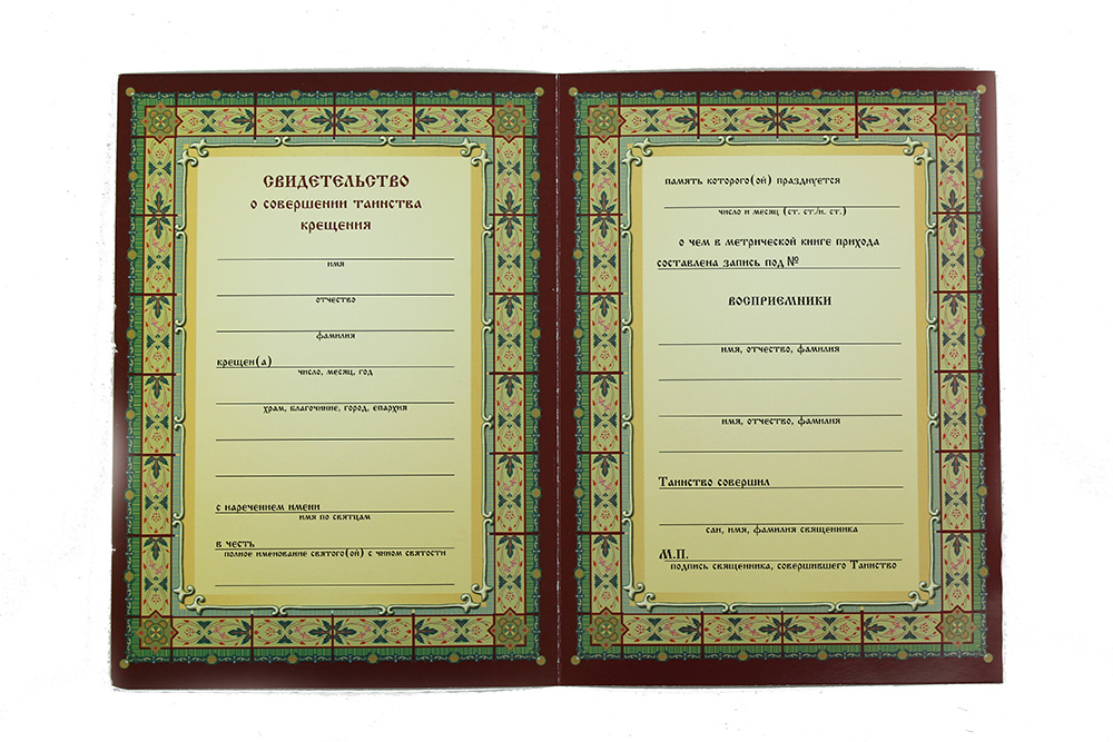 Свидетельство о совершении таинства крещения коричневое (100шт.в упаковке, 500шт. в коробке)