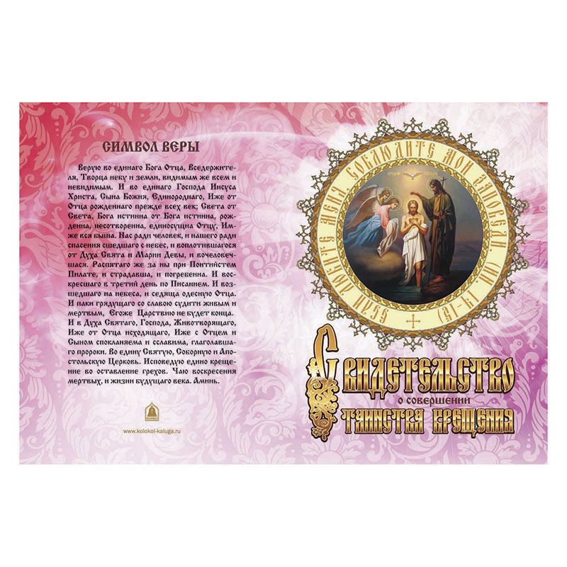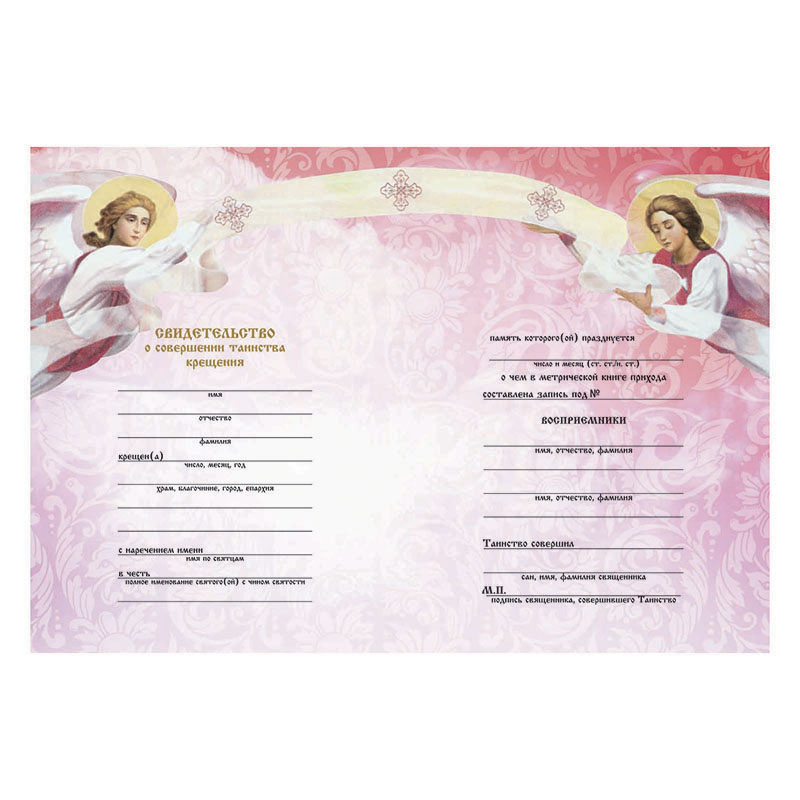 Свидетельство о совершении таинства крещения розовое (100шт.в упаковке, 500шт. в коробке)