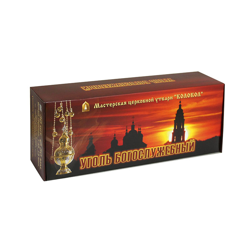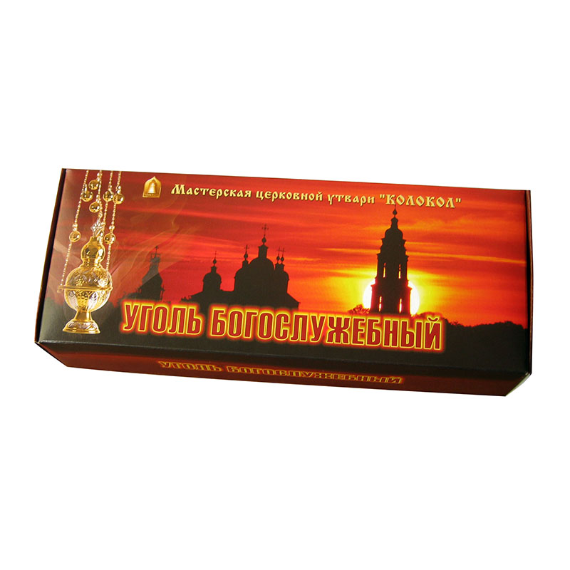 Не только ладан, но и кадильный уголь должен быть отменного качества, поскольку долго разгорающиеся и быстро затухающие угли доставляют немало хлопот во время треб и службы. Производственные мастерские «Колокол» предлагают уголь богослужебный диаметром 50мм по 30 таблеток в коробке, изготовленный из высокосортного угольного порошка, спрессованного в «порционные» таблетки. В их изготовлении не использованы вредные добавки, делая применение абсолютно безопасным. Малое время розжига позволяет применять уголь во время отправления треб, а стабильное горение в течении полутора часов идеально соответствует продолжительным церковным службам.
