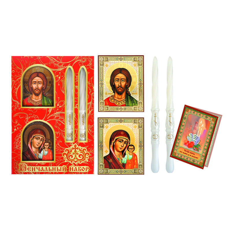 В набор входит свидетельство о совершении таинства брака, венчальные свечи из парафина, две иконы: БМ Казанская и Господь Вседержитель.